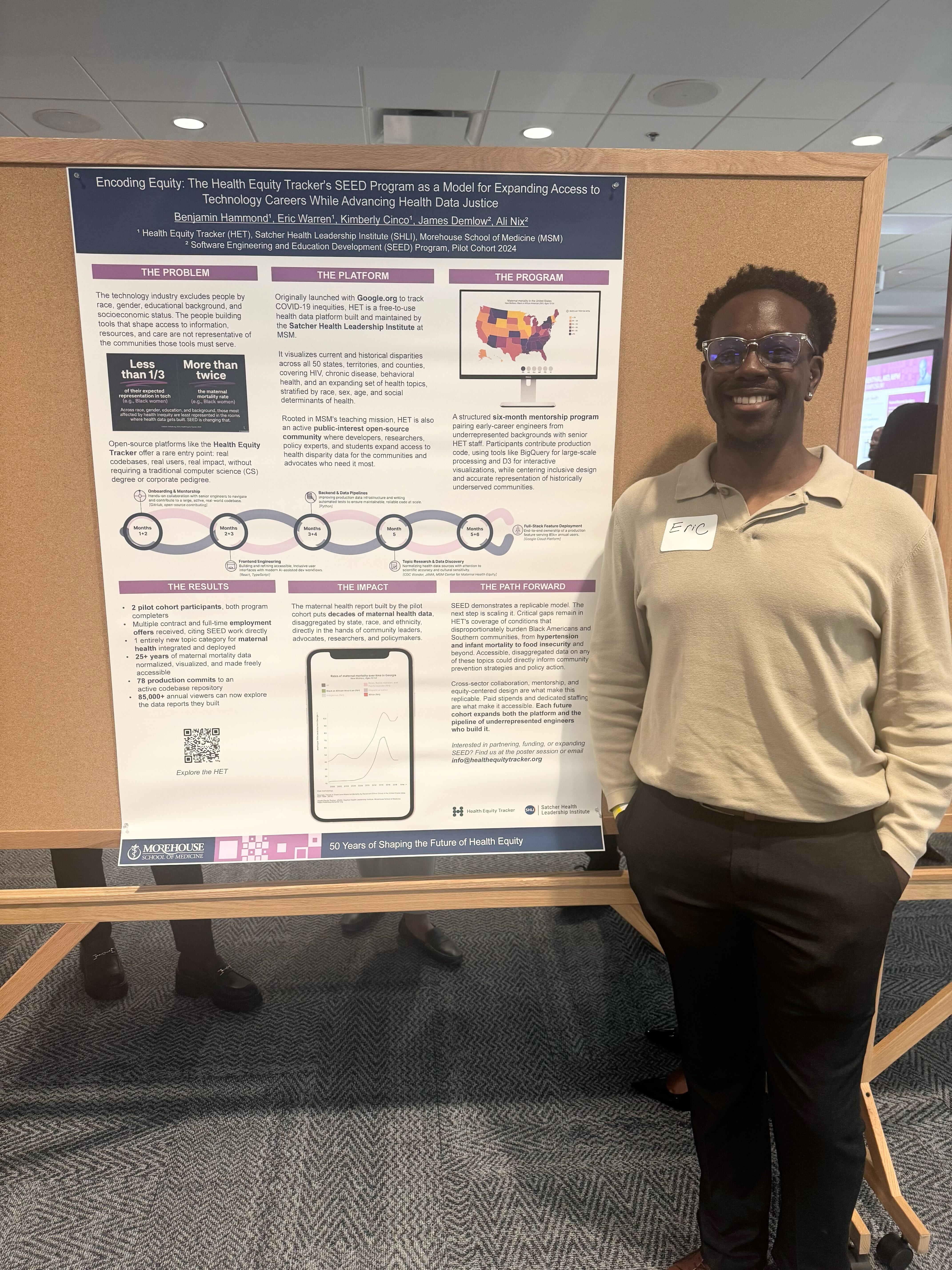 I was there representing the Health Equity Tracker (HET) and our Software Engineering and Education Development (SEED) program. The poster session was genuinely one of my favorite parts of the day. We had the chance to share how SEED is working to expand access to tech careers for engineers from underrepresented backgrounds while simultaneously advancing the HET's mission of making health disparity data freely accessible to everyone who needs it.
